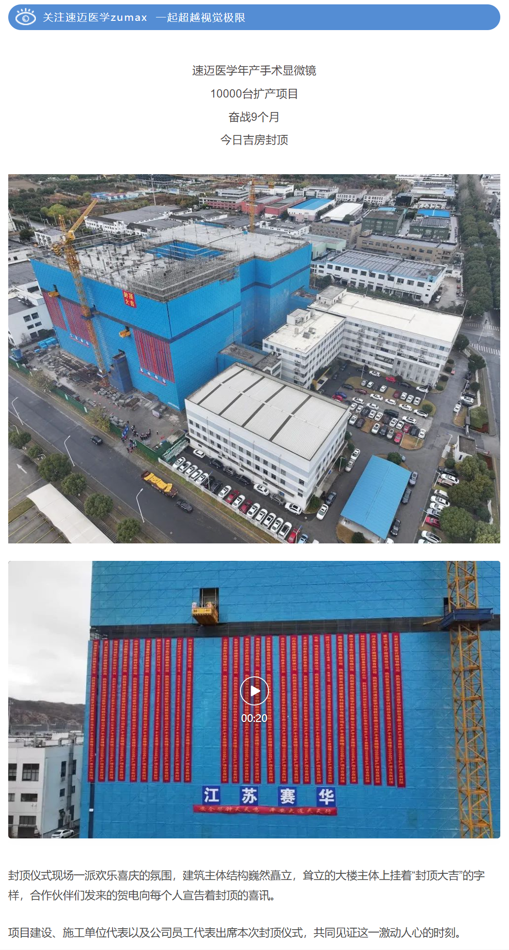 封顶大吉!速迈医学年产手术显微镜10000台扩产项目吉房封顶